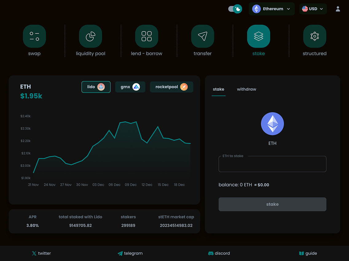 DeFi Experience: Guided steps for staking and yield farming. Visual representations of asset growth.